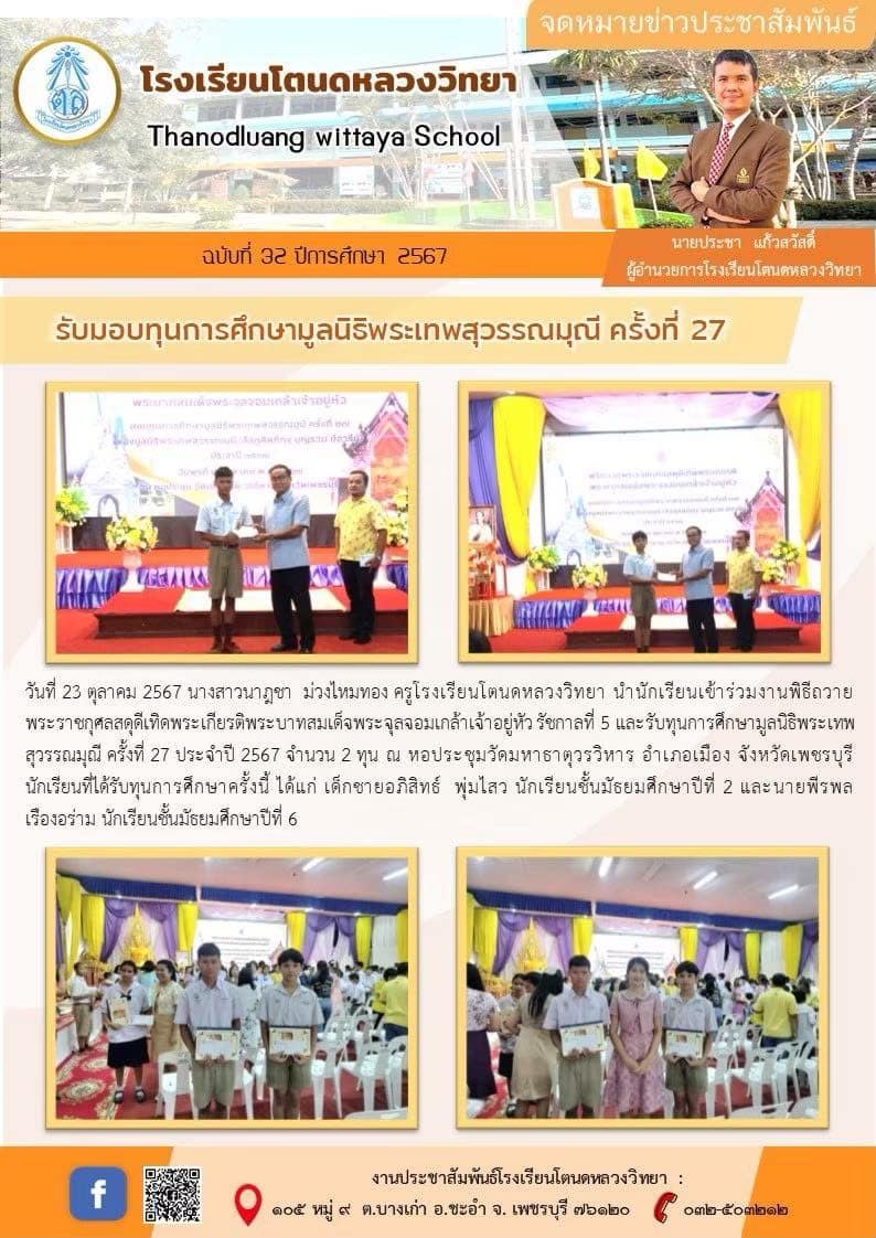 วันที่ 23 ตุลาคม 2567 นางสาวนาฎชา ม่วงไหมทอง ครูโรงเรียนโตนดหลวงวิทยา นำนักเรียนเข้าร่วมงานพิธีถวาย พระราชกุศลสดุดีเทิดพระเกียรติพระบาทสมเด็จพระจุลจอมเกล้าเจ้าอยู่หัว รัชกาลที่ 5 และรับทุนการศึกษามูลนิธิพระเทพสุวรรณมุณี ครั้งที่ 27 ประจำปี 2567 จำนวน 2 ทุน ณ หอประชุมวัดมหาธาตุวรวิหาร อำเภอเมือง จังหวัดเพชรบุรี นักเรียนที่ได้รับทุนการศึกษาครั้งนี้ ได้แก่ เด็กชายอภิสิทธ์ พุ่มไสว นักเรียนชั้นมัธยมศึกษาปีที่ 2 และนายพีรพล เรืองอร่าม นักเรียนชั้นมัธยมศึกษาปีที่ 6